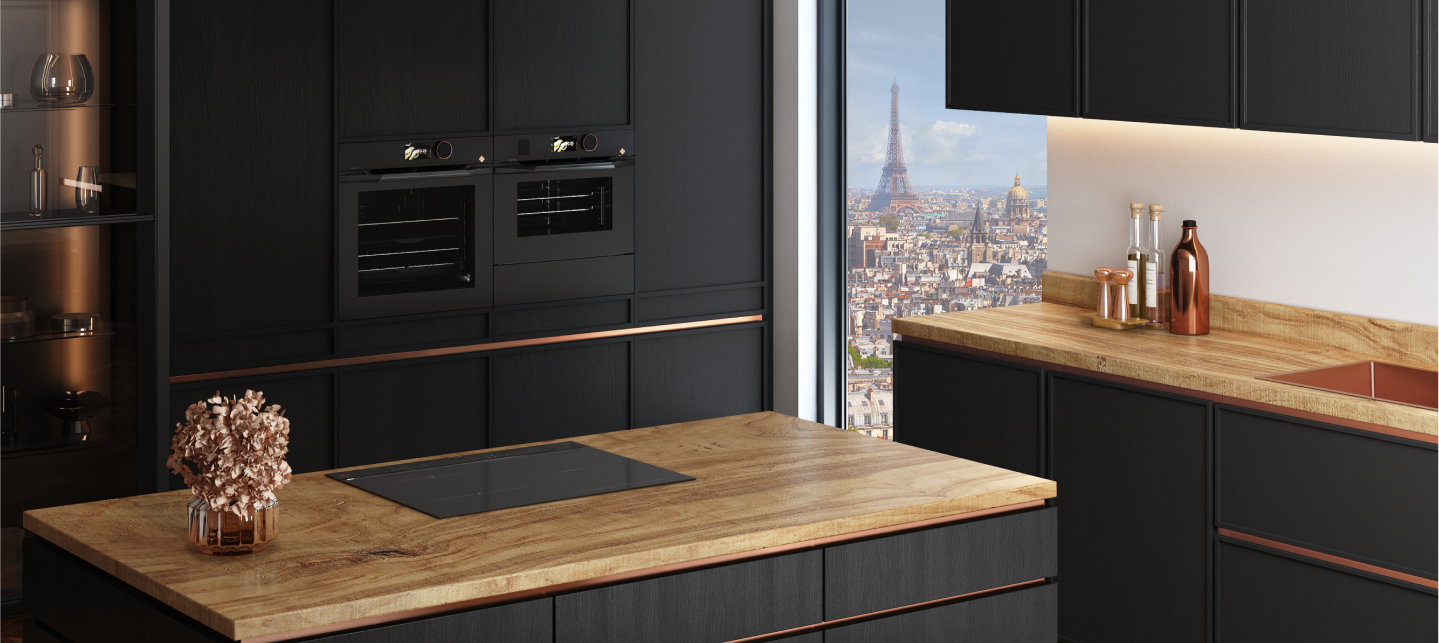Touches de cuivre et cor de chasse : sertis dans le noir brillant des surfaces, les marqueurs historiques de De Dietrich sont réinterprétés dans un esprit précieux et très contemporain. Un hommage au patrimoine ancestral de la marque et à sa puissance d’innovation.