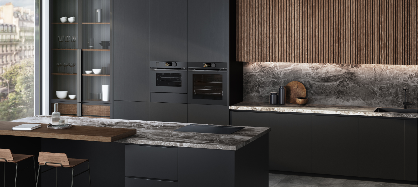 Cette sonate en noir dominant est rythmée par des éclats d’inox, tantôt brossé, tantôt poli façon miroir. Une inspiration très contemporaine où le métal structure la profondeur du noir pour rendre encore plus palpable la qualité de la fabrication et des matériaux.